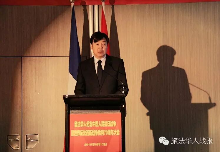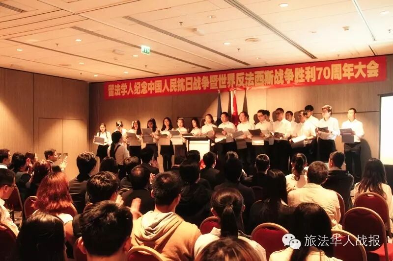 (新欧洲战报记者 吴忱)9月12日下午,在中国驻法使馆教育处支持下,由全法中国学者学生联合会(全法学联)、全法中国科技工作者协会(全法科协)共同发起,以“铭记历史、缅怀先烈、珍爱和平、开创未来”为主题的“留法学人纪念中国人民抗日战争暨世界反法西斯战争胜利七十周年大会”在巴黎隆重举行。 来自全法学联各地区学联、校级学联、旅法专业协会、中国高校法国校友会等留法学人团体的代表350余人参加大会。中国驻法大使翟隽、驻法使馆教育处公使衔参赞马燕生、全法学联主席王珂、全法科协理事长李皓等出席大会,全法学联副主席付超主持大会,大家共同铭记战争历史,正面现实责任,展望和平未来。 大会首先在雄壮的国歌声中拉开帷幕。接着,在巴黎学联合唱团的带领下,一曲《保卫黄河》慷慨激昂、响彻会场,唱出了全体与会人员对先烈的深切缅怀和对历史的矢志不忘,唱出了留法学人热爱和平的由衷心声和面向未来的美好期望。