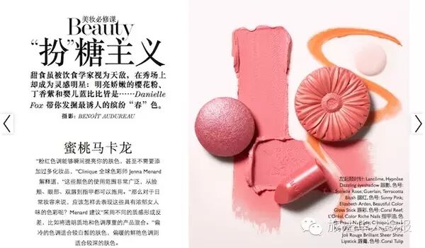 2014年4月17日The Edit杂志讲解如何打造马卡龙式妆容 奢侈品的概念永不过时,跨界合作更是时尚界最喜欢的玩法。2013年Ladurée与艺术家Will Cotton合作限量礼盒,礼盒上绘制了一位身穿奶油礼服的时髦女郎,内容则配合新推出的生姜奶油口味;2012年9月,与法国高级时装品牌Lanvin设计师Alber Elbaz合作推出限量版马卡龙礼盒,盒子上面遍布Lanvin标志性的逗趣手绘图案,礼盒里共装有八个泡泡糖口味的马卡龙;类似合作过的时尚品牌或者设计师还包括Tsumori Chisato、Christian Louboutin、John Galliano、 Marni、Christian Lacroix等等,甚至Hello Kitty。它还和日本彩妆品牌Albion合作推出了自己的彩妆线 Les Merveilleuses De Ladurée,名正言顺跻身时尚杂志。 Ladurée也不放过任何一次营销机会,英女王钻禧期间它推出米字旗版礼盒搭配红白两色马卡龙,万圣节推出黑底色加金色古典印花礼盒搭配南瓜色马卡龙——感谢这款小圆饼给糕点师们巨大的创作空间,如论是神口味,何种色调,只要场合需要,他们真是都什么都做得出!