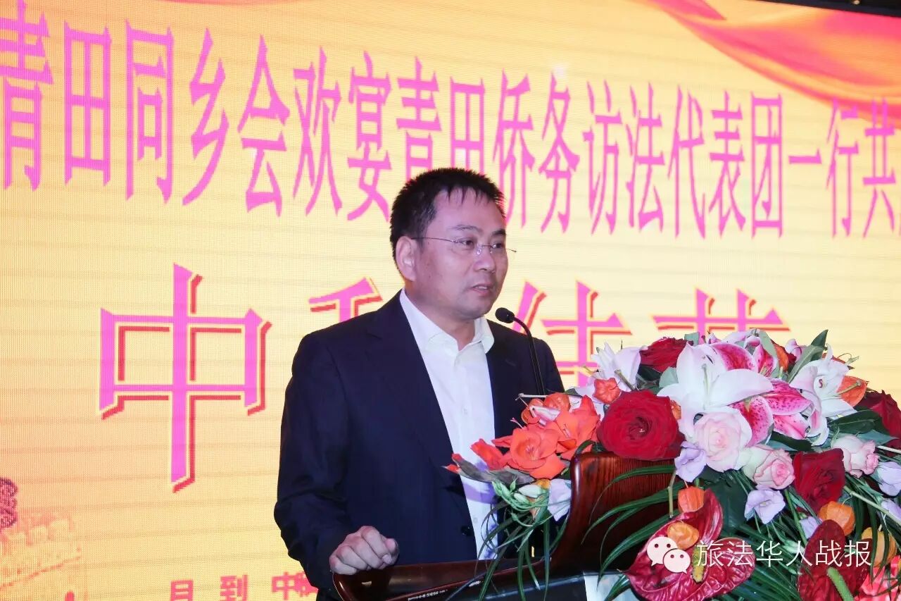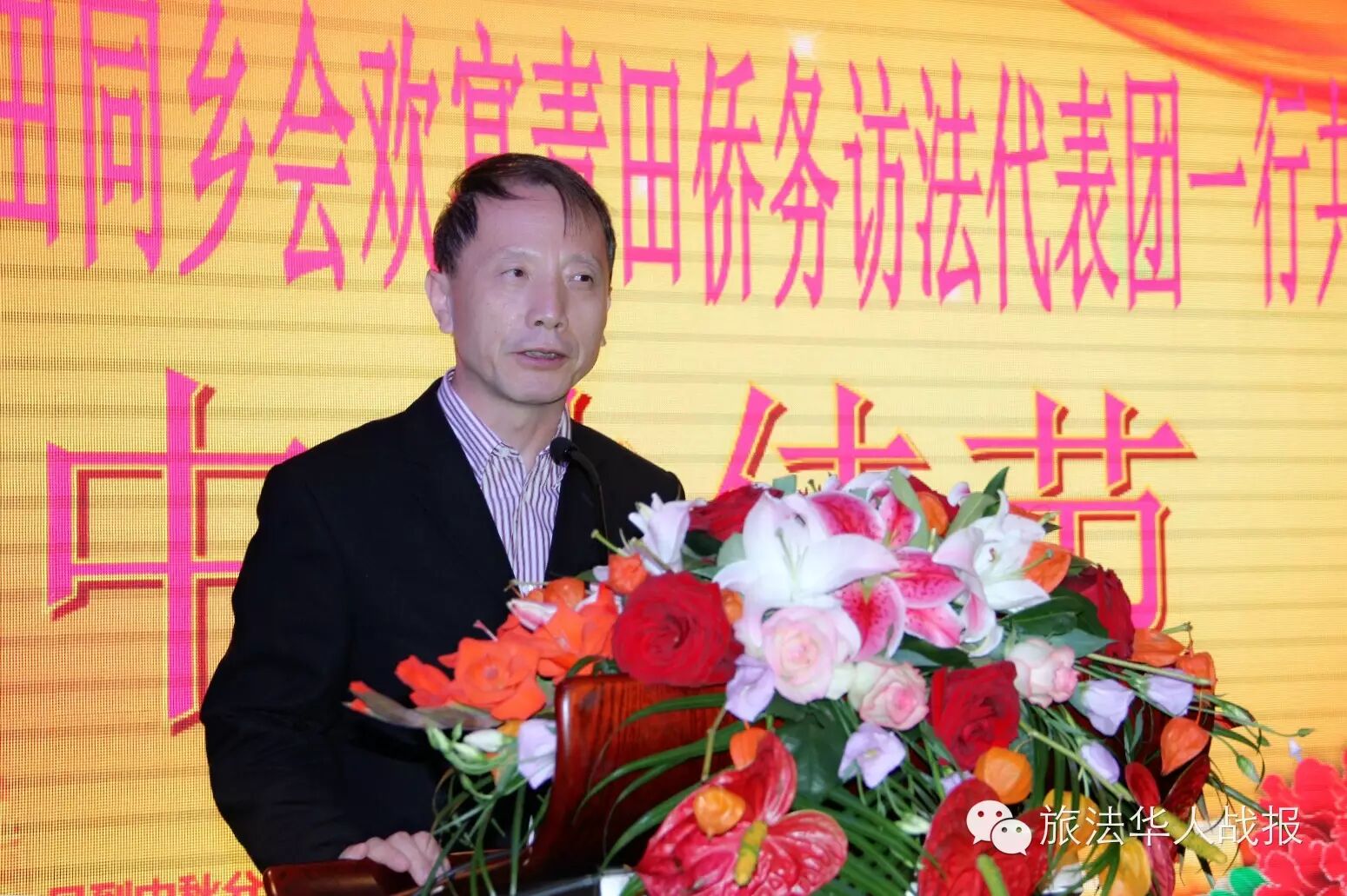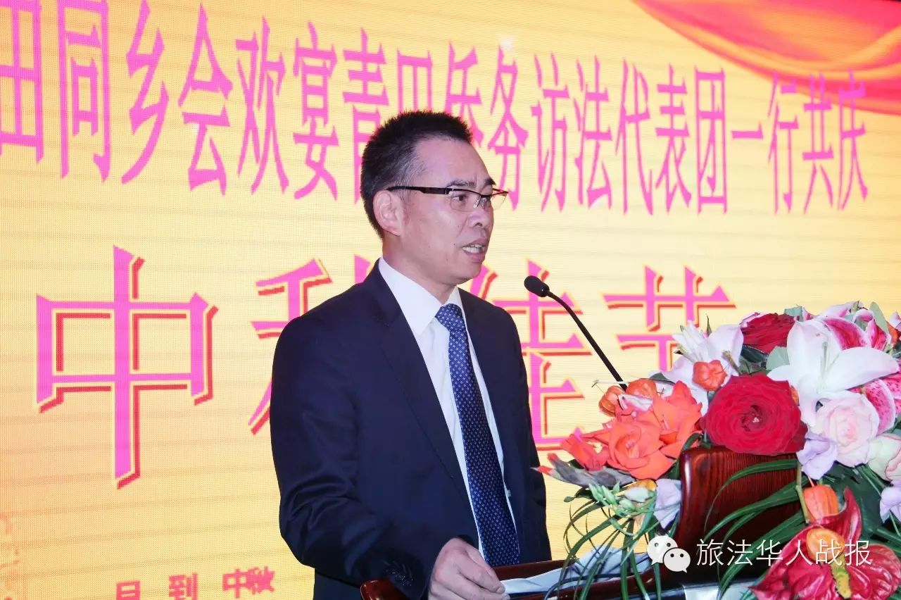 青田县副县长陈海民在讲话中向旅法青田侨胞致以亲切的问候。陈海民表示,本次访问欧洲包括奥地利、意大利,巴黎是第三站,一路上感受到浓浓的乡情,并且深感自豪、自在和自信。 青田侨行天下,侨胞们在当地使领馆的正确指导下,事业有成,积极融入,并且爱国爱乡,维护祖国尊严,在世界各地都获得了极高的美誉度,值得自豪;本次代表团访欧,建立侨民服务机制,达成友城合作计划,征求当地意见建议,招商引资招才引智,顺利完成了各项任务,而且在与侨胞的会面中,大家畅叙乡情,自在如归;通过与侨胞的交流,深刻体会到青田乡亲维护祖国统一和尊严的强国之志和报国之行,有海外三十多万青田侨胞的推动,相信家乡的未来一定更美好。最后,陈海民祝愿旅居法国的青田侨胞中秋快乐,万事如意。