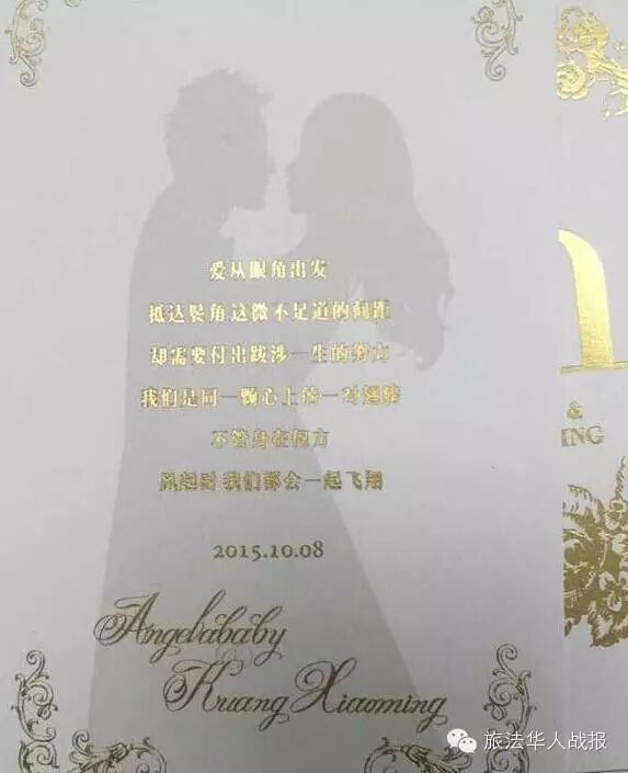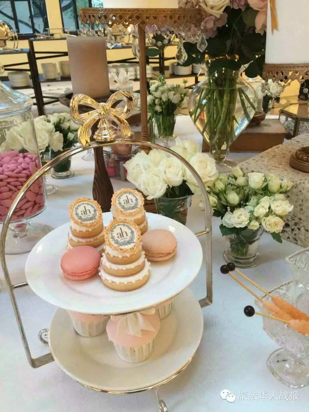 教主和Angelababy的喜帖以“ah”为缩写,喜帖上印有教主同baby的剪影,更写上“我们是同一颗心上的一对翅膀,不管身在何方,风起时,我们都会一起飞翔。”下面的花体签名让浪漫的风格从请柬上延续到了每个人心里面。 5法式元素之甜品