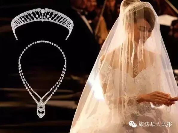 周杰伦与昆凌婚礼上新娘佩戴的珠宝来自Chaumet的“Lumieres-d'Eau水之光”高定珠宝套系钻冕及项链。