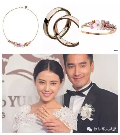 高圆圆佩戴Chaumet Plume 18K对戒步入婚姻殿堂。当天婚礼上惊艳四座的绣球花手镯也同样来自于这个品牌。