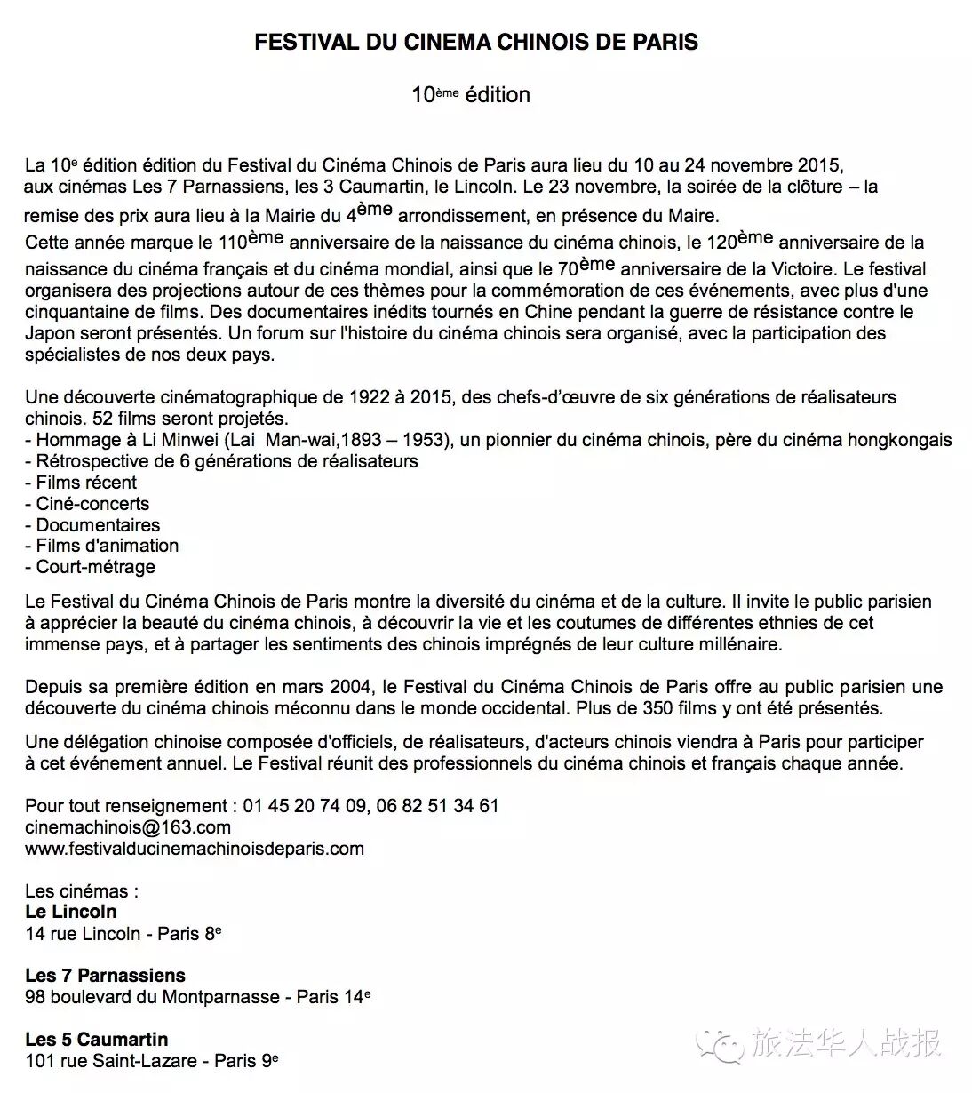 (新欧洲战报讯)11月10日至24日,第十届巴黎中国电影节将在巴黎巴纳贤电影院(Les 7 Parnassiens)、高马登电影院(Les 5 Caumartin)、林肯电影院(Le Lincoln)登场。 2015年是中国电影诞辰110周年,法国暨世界电影诞辰120周年,抗战胜利70周年纪念。本次电影节将围绕这些主题,放映精彩的故事片和历史文献纪录片,并组织中法研讨会,通过从第一代中国电影开拓人至第六代年轻电影人的作品介绍放映,系统地展现中国电影史。 电影节设七个单元: