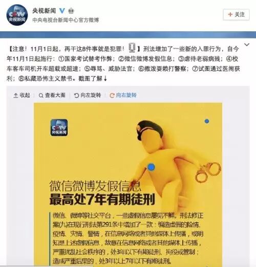 (新欧洲战报讯)据央视新闻官方微博报道,自11月1日起,在微信、微博等社交平台传播虚假消息,造成严重后果的,最高处以7年有期徒刑。 刑法修正案(九)在现行刑法第291条中增加了一款:编造虚假的险情、疫情、灾情、警情,在信息网络或者其他媒体上传播,或明知是上述虚假信息,故意在信息网络或者其他媒体上传播,严重扰乱社会秩序的,处3年以下有期徒刑、拘役或管制;造成严重后果的,处3年以上7年以下有期徒刑。 微博、微信等社交平台上,一些虚假信息屡见不鲜。据《新媒体蓝皮书》发布的数据,近六成的互联网虚假新闻来源于微博,其中包括微博博主恶意编写的新闻事件,以及根据当下流行的新闻事件进行篡改。随着微商的崛起,微信也成为谣言和虚假广告的重灾区。 最高法此前发布相关规定,利用网络诽谤他人,同一诽谤信息实际被点击、浏览次数达到5000次以上,或者被转发次数达到500次以上,应当认定为刑法第246条第1款规定的“情节严重”,构成诽谤罪。 此外,9月27日,国家工商总局广告监督管理司司长张国华首次公开表示,微信朋友圈转发广告须遵守新《广告法》,对于影响用户体验的虚假广告,消费者可向工商局部门举报。按照《广告法》规定,发布虚假广告最高可处100万元(人民币)以上200万元以下罚款,后果严重的还须承担刑事责任。 所以战报君提醒大家,从自身做起,不造谣,不传谣,管住自己的嘴和自己的手,并且增强自己的辨识力,不轻信,不轻易被忽悠,以免悲剧了。 (编辑:鲁佳) |
