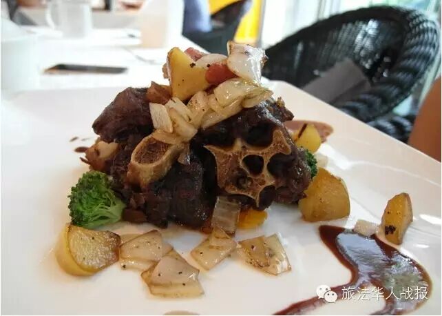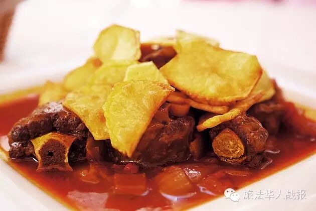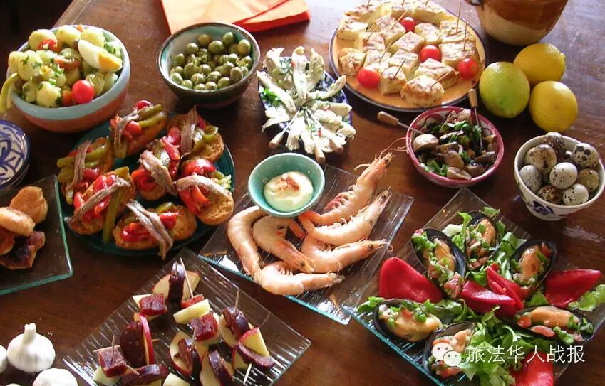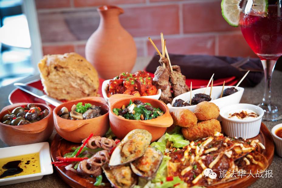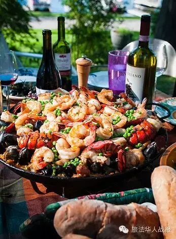 来宾都会送一小碗腌过的橄榄,味道惊喜,不是沙拉里面那种太咸太酸的味道,而是用特殊调料腌过,值得一试。Calamars a l’encre de seiche et poireaux就是传说中的墨鱼海鲜饭了,里面有虾,墨鱼,洋葱等等的材料,虽然看着黑乎乎一片,但墨鱼的鲜味和米饭的醇香融为一体,十分美味。 ————西班牙菜———— 提到西餐,很多人觉得那都是一回事儿。殊不知在地域差异和人文风情的影响下,即使在欧洲大陆上,每个国家的饮食习惯和风格也是千差万别。西班牙美食和她的民族文化一样,需要长时间了解与品尝,了解这个民族的特性有助于对其美食的鉴赏。试想西班牙人最讲究的午餐可以三至四个钟头来享用,其间便有其享受美食的哲学。