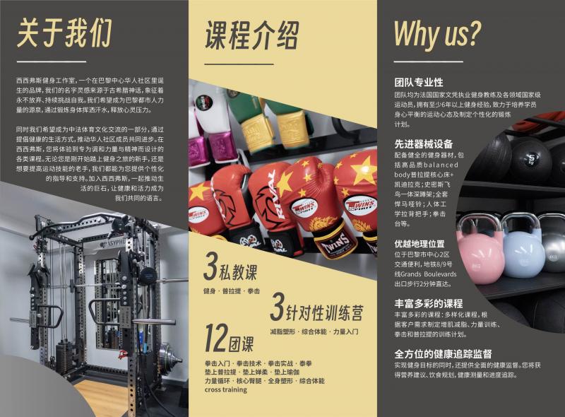 西西弗斯健身工作室,一个在巴黎中心华人社区里诞生的品牌,我们的名字灵感来源于古希腊神话,象征着永不放弃、持续挑战自我。我们希望成为巴黎都市人力量的源泉,通过锻炼身体挥洒汗水,释放心灵压力。同时我们希望成为中法体育文化交流的一部分,通过提倡健康的生活方式,推动华人社区成员共同进步。在西西弗斯,您将体验到专为调和力量与精神而设计的各类课程。无论您是刚开始踏上健身之旅的新手,还是想要提高运动技能的老手,我们都能为您提供个性化的指导和支持。加入西西弗斯,一起推动生 活的巨石,让健康和活力成为 我们共同的语言。