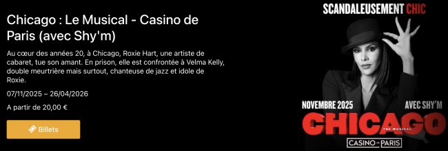 🎭 百老汇经典《Chicago芝加哥》重磅回归法国舞台! 💃 性感、讽刺、节奏炸裂的百老汇神作《Chicago》,这次火热登陆法国! 从爵士乐到黑色幽默,从魅惑舞姿到罪与欲的交织——这部荣获6项托尼奖的经典音乐剧,堪称百老汇的灵魂象征! 从1975年首演到如今,《Chicago》火了整整50年还在全球巡演——这不是奇迹,而是实力! 一首《All That Jazz》一响,全场立刻炸裂⚡️爵士乐的性感、舞台的冷艳、欲望与权力的角逐,浓烈到令人窒息。 👉 Fnac Spectacles 官方直达 >>  🔥 剧情亮点: 当女主Roxie和Velma两位“蛇蝎美人”同台斗艳,一场关于名利、谋杀与媒体的游戏就此上演。 魅惑与讽刺齐飞,现场管弦乐团让每一个音符都充满罪恶的诱惑! 📍演出城市:巴黎 📅 演出时间:2025年11月7日 - 2026年4月26日 💸 抢票入口: 👉 Fnac Spectacles 官方直达 >> 🌟 不论你是音乐剧老粉,还是第一次入坑,《Chicago》都是绝对不容错过的舞台盛宴—— 一场关于“欲望、权力与掌声”的华丽罪恶秀,保证让你从开场的第一分钟就上头! 🔥 本轮巴黎复演由打造《狮子王》的传奇团队 Stage Entertainment 操刀, 视觉、舞美、音乐全面升级!精彩不容错过!  *文中的图片链接素材来源于网络,一切版权归原作者所有©