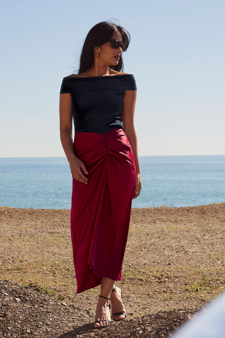 折扣专区单品|心形领丝绸针织上衣单品|苋菜色裙子