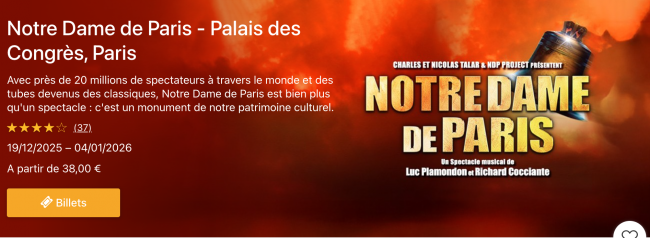 🏯法国殿堂级经典《巴黎圣母院 Notre-Dame de Paris》25周年震撼回归! 💔 从《Belle》的撕心裂肺,到卡西莫多的孤独深情,这部音乐剧不仅是法国舞台的骄傲,更是无数观众心中不可取代的殿堂级经典!自1998年首演以来,《Notre-Dame de Paris》巡演全球30余国,累计观众超1500万人次——真正的“国民级音乐剧”,一响起就让人泪目! 🔥 这次回归巴黎,不只是重演,而是一次“回到原点”的致敬: 宏伟的巴黎圣母院舞台再度重建,极致灯光与震撼人声交织,每一个音符都像从哥特穹顶倾泻而下的光。 “她,是巴黎的灵魂;他们,是命运的悲歌。”爱与欲、信仰与宿命,所有的冲突都在这座石之教堂里爆发。 👉 Fnac Spectacles 官方直达 >>  🔥 剧情亮点: 当美丽的吉普赛女郎 Esmeralda 走进卡西莫多与副主教 Frollo 的世界, 爱与嫉妒、救赎与毁灭的交织,点燃了这座城市的悲剧。 原声乐曲《Belle》《Le Temps des Cathédrales》等全场合唱,撕裂人心的旋律,让观众一次次泪目。 📍 演出城市:巴黎