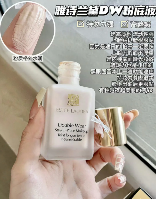 💓 优惠详情😍 雅诗兰黛DW粉底液30ml >>无门槛闪促53折!无需折扣码! 👉 折后30€拿下!油皮亲妈!不是吹的!越夜越美丽! 🎁 送礼详解👉 买DW粉底液>>就送泵头1个!就算自己买还要8€!!  👉 可叠加折后满70€就送5件大礼包价值63€!11.6号截止! 含:小棕瓶精华7ml➕智妍晚霜7ml➕净澈洁面30ml➕迷你睫毛膏!  👉 购物车界面还可叠加自选试用装!满60€送自选2件,满120€送自选3件! 优先选择价值29€的线雕精华7ml ,价值28€的小棕瓶眼精华5ml、或者智妍面霜5ml、智妍晚霜5ml等! ⚠️ 建议小伙伴们一定要选最贵的礼品奥!!送礼选对,价值60€的额外礼品带回家!!  🟩 单品推荐DW粉底液 适合出油多的大油皮 厚乳霜的浓稠质地 流动性没那么强 速干型粉底液 上脸要快准狠 瑕疵多的地方多叠加两层 大哑光的雾面妆效 有妆感不假白 遮瑕力还是很不错的 黑眼圈、毛孔能遮得住     🟠 测试图 图片链接素材来源red,@舌灿桃花@玉玉子@TIME GALLERY美妆店@奈奈版权归原作者所有!