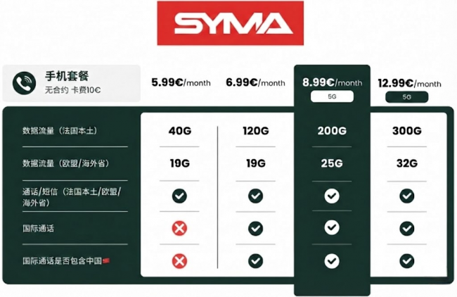 💓 优惠详情SYMA 手机套餐>> 超划算套餐! 💥 5G高速冲浪,畅快无阻! 🔄 无合约套餐,自由切换,想换就换! 🌍 全球100+国家打电话免费(包含中国)——涵盖国内固定电话+移动电话☎️办理国内业务、接打电话、收发短信完全无压力!短期回国也能轻松搞定! 🌐 欧盟免费流量,出差旅游随时上网,毫无后顾之忧。 📶 使用SFR网络,信号稳定无烦恼! 📞 免费保留号码,换运营商也无需担心任何问题! 🟩 单品推荐8.99€ 200G 5G套餐 ⭐️ 5G信号📶含法国境内流量200G,欧盟内及海外领地流量25G ⭐️ 法国和欧盟境内无限电话+短信 ⭐️ 免费拨打电话:法国境内可向100+个目的地拨打电话(包括中国) ⚠️5.99€套餐不包含免费拨打国内电话 100个免费拨打的目的地列表👇快来看看是否满足你的需要~  下载MySyma应用,即可即时查看流量、切换套餐或选项、更新个人信息、充值、查看账单等 Syma提供免费客户支持,如有疑问可通过电话、在线聊天和电子邮件联系,并提供多语言支持 *图片链接素材来源于网络,版权归原作者所有
