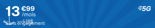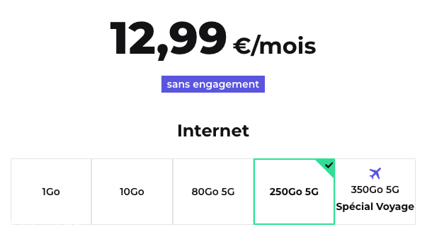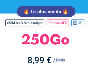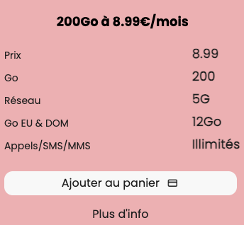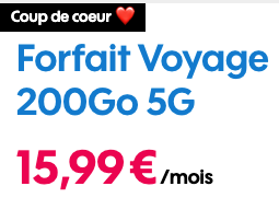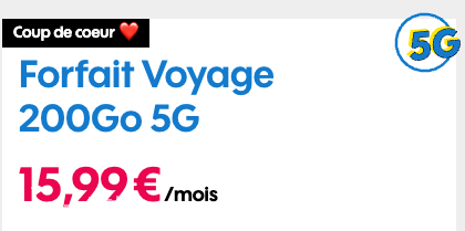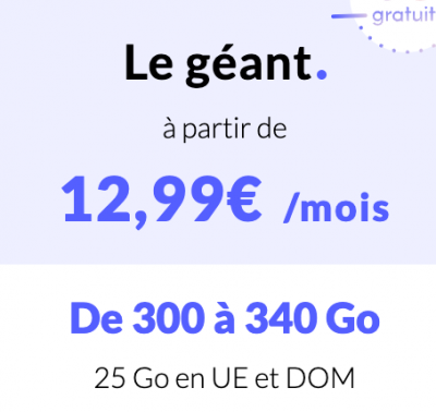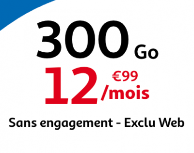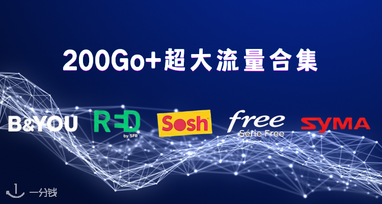 相关链接 NRJ 无限流量 17.49€Syma 300Go 12.99€Auchan 300Go 12.99€Prixtel 300Go 12.99€Lebara 250G 8.99€RED 250Go 12.99€Bouygues 200Go 13.99€SOSH 200Go 15.99€Youprice 200Go 8.99€