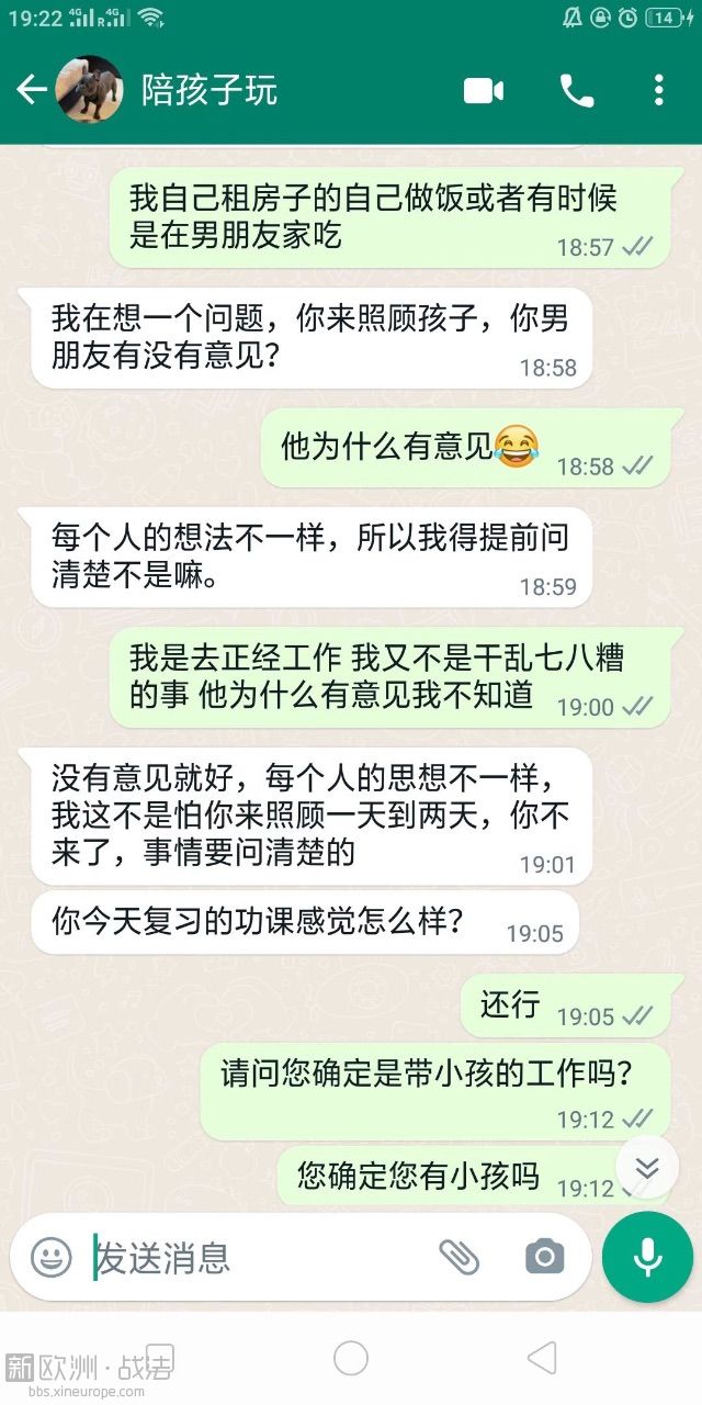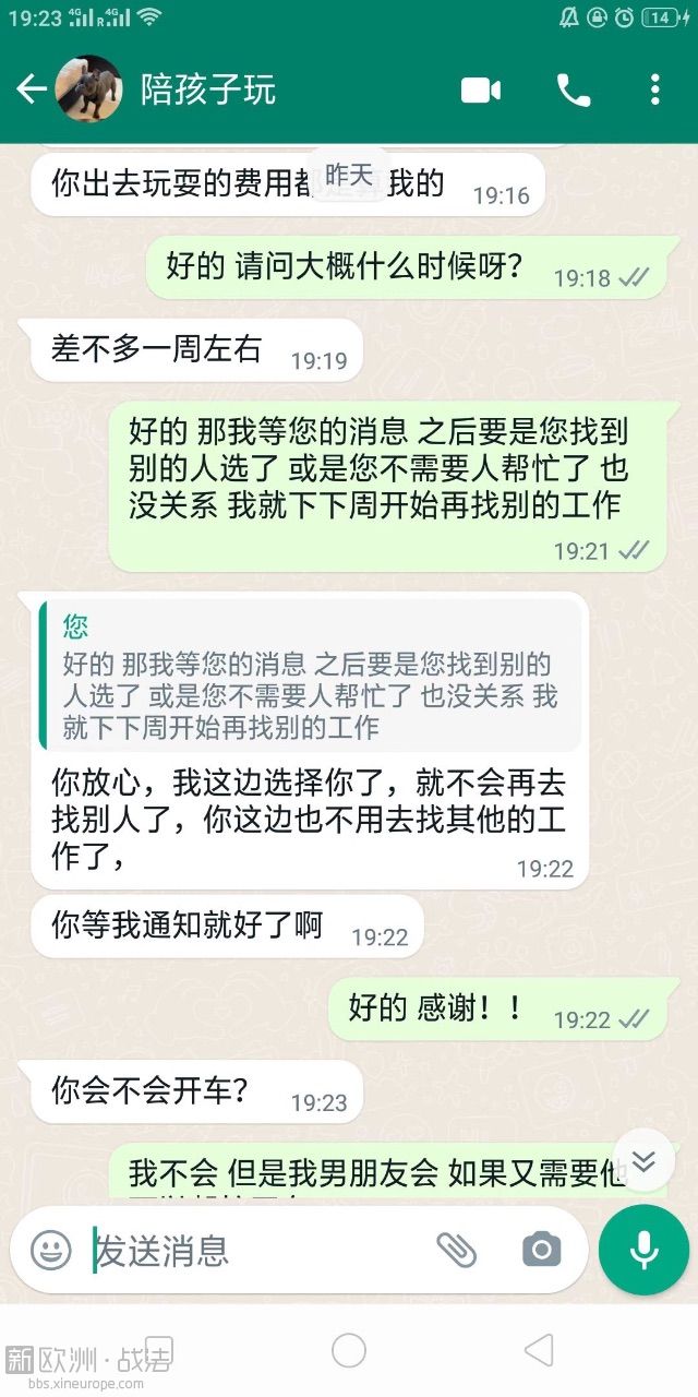 图二是为自己刚从国内来的十岁儿子找陪玩家教。该男浮夸炫富油腻。我发了中法的简历,他偏说是英文简历。还说我会做菜挺好的,我根本没提到做菜什么的,并且我根本不会做菜。然后又说保持联系,这两天天天发消息,我硬着头皮耐着性子回他消息。还和我说什么比特币市场不稳定,问我我来看孩子男朋友有没有意见,wtf。然后又看到了重新发帖招工,表示待遇极好自己极其有钱的意思。