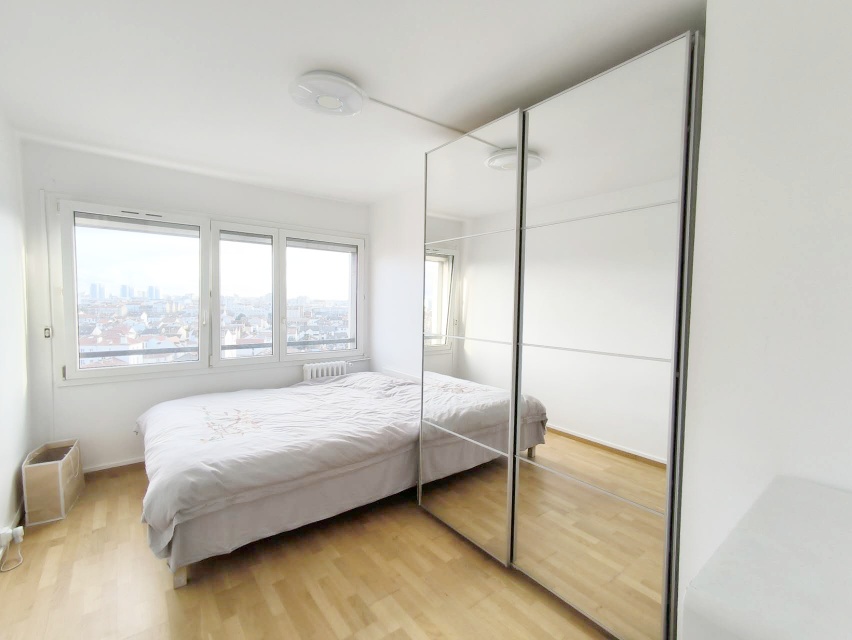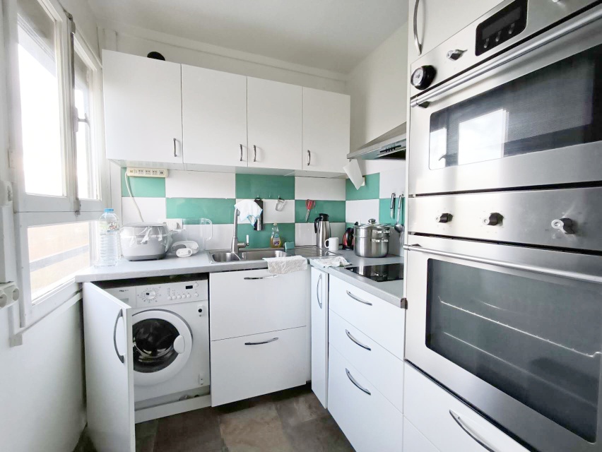 【格局】法国9楼带电梯,50平两室一厅。中央供暖,集中热水。两间卧室均配有双人床和大衣柜;客厅配有沙发床和餐桌,采光非常好。厨房为开放式整体厨房,设备齐全,含烤箱、微波炉、洗衣机、嵌入式冰箱及炉灶。