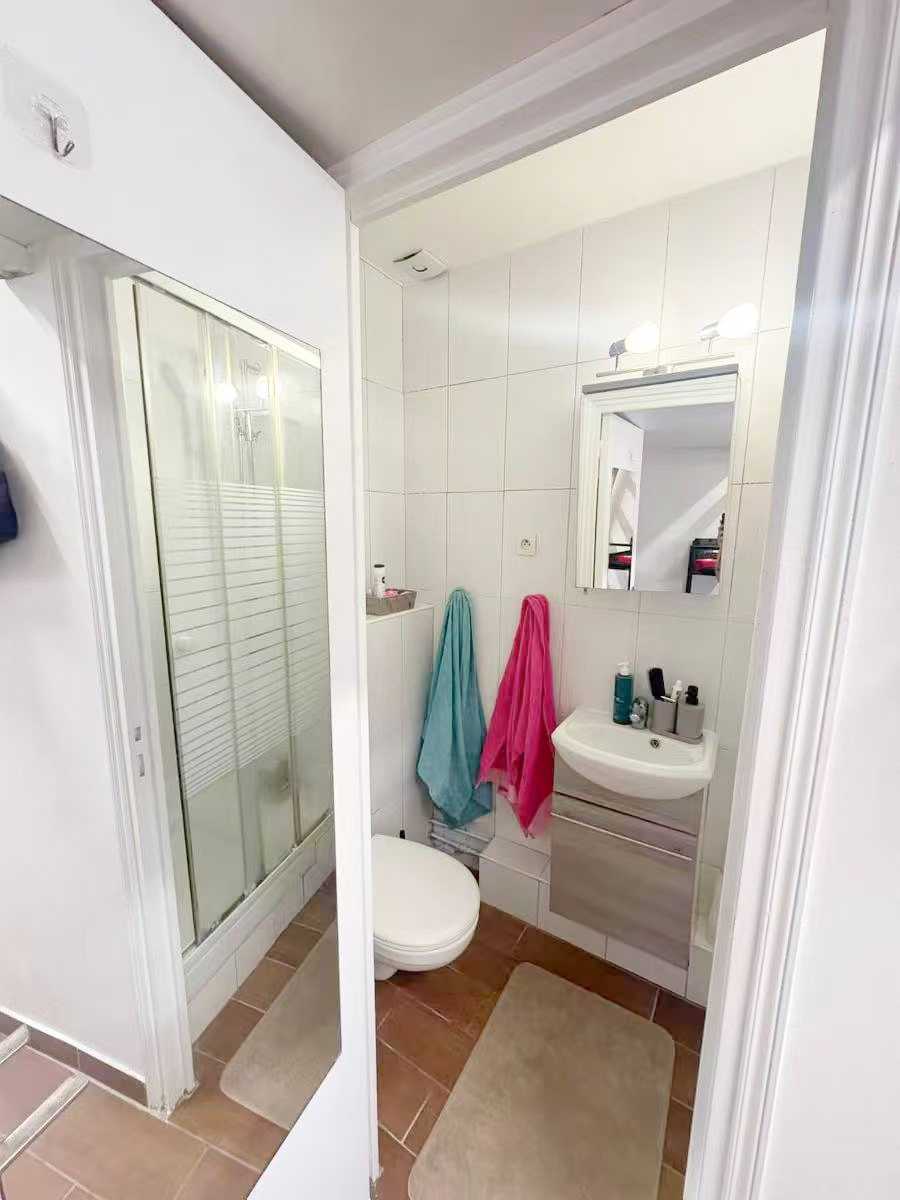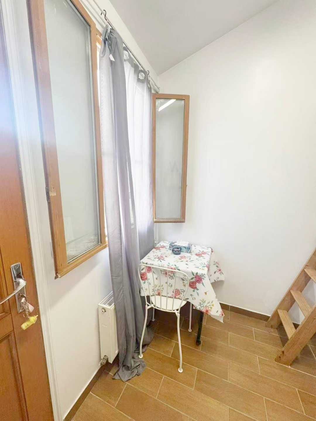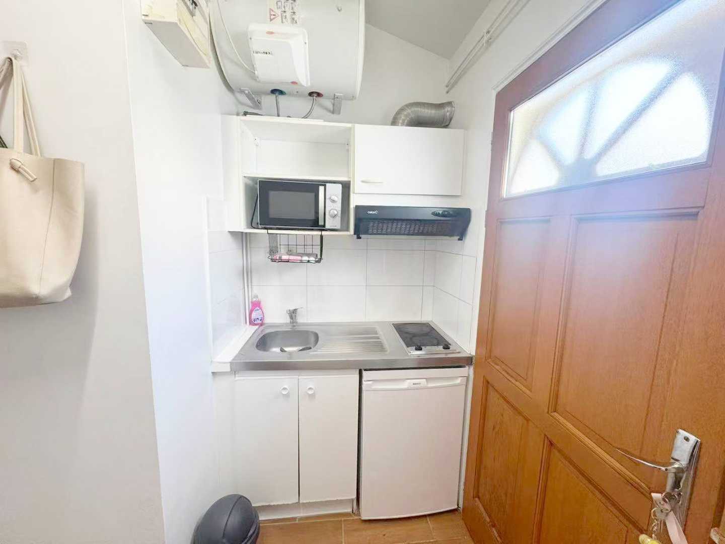 【户型】位于安静小楼底层(RDC)朝院子,Studio约12平,房内配备上下床、衣柜、书桌等基本家具。开放厨房,独立卫浴,洗衣机为4人共用。厨房设施齐全:电磁炉、抽油烟机、冰箱等,中央暖气,电热水器,独立电表。