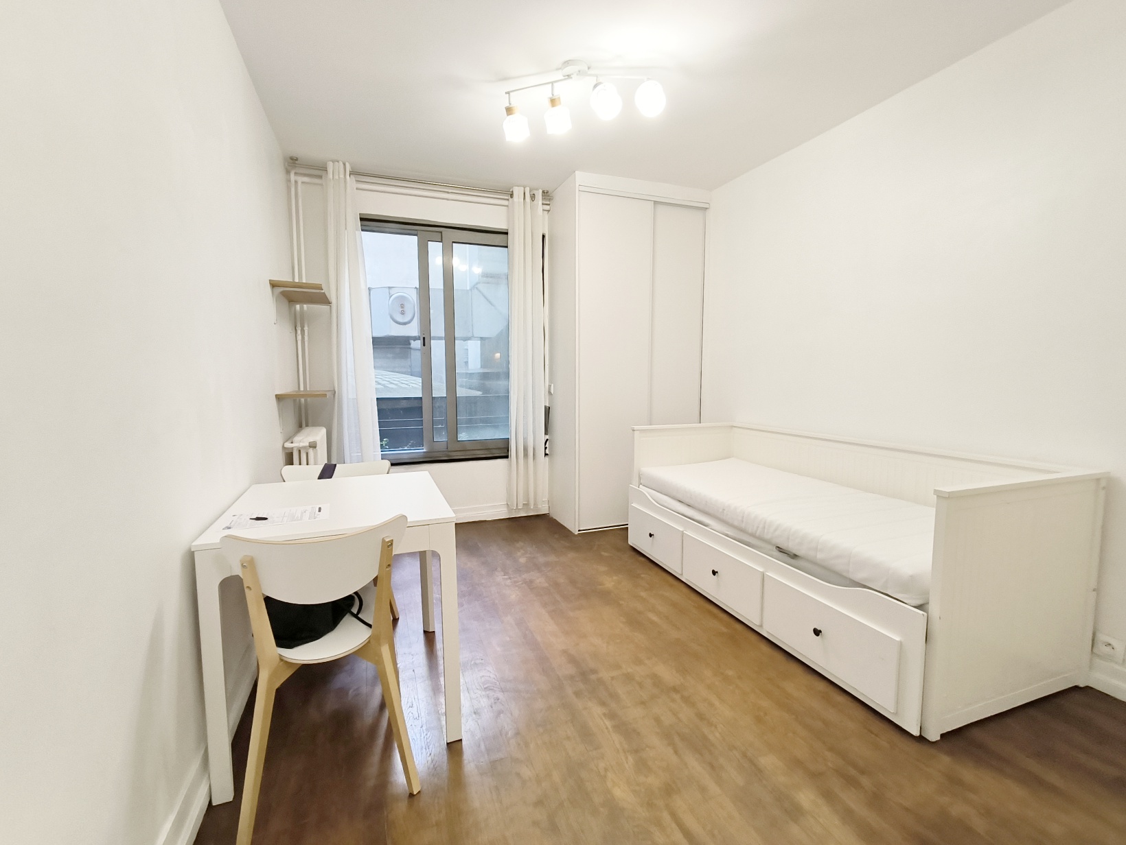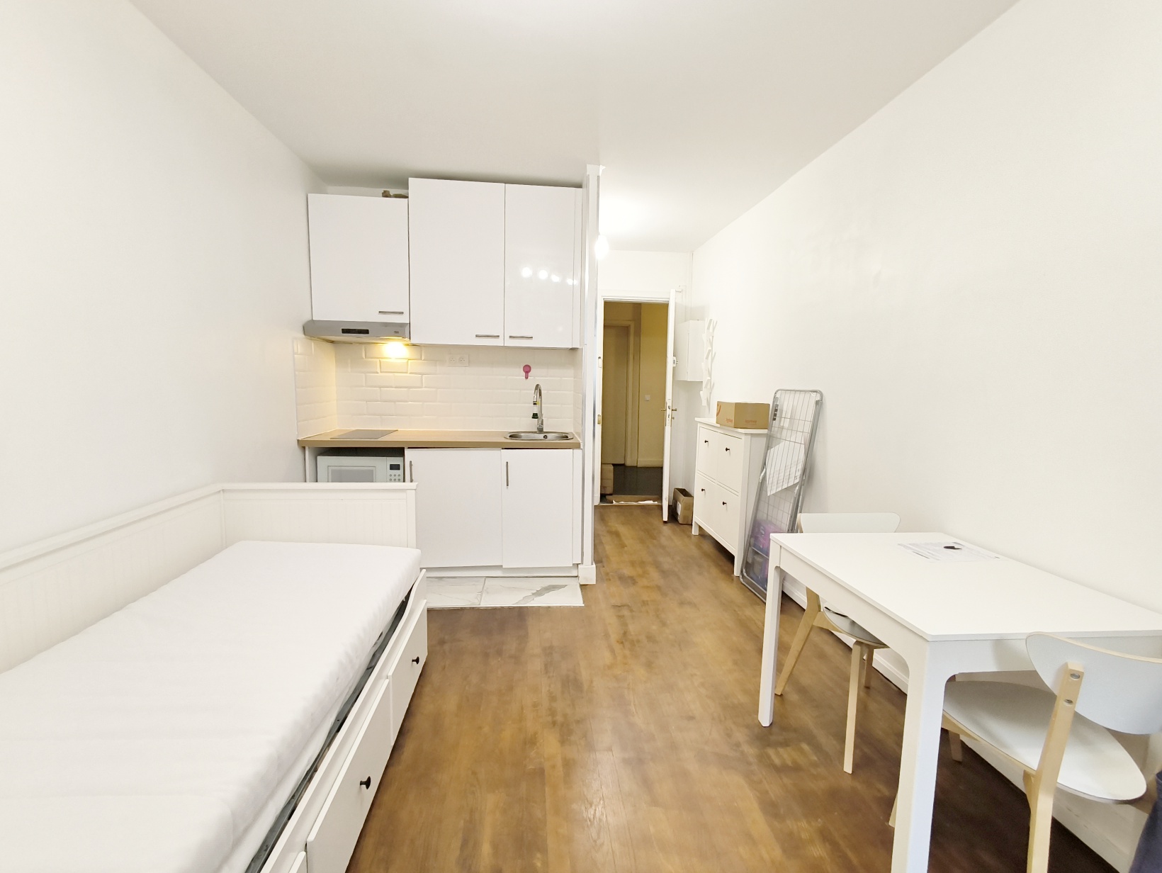 【格局】位于法国1楼有电梯,18平studio,家电齐全,单人床拉开可变双人床,全新衣柜鞋柜,多处储存空间,餐桌可拉开变成大桌子,还有咖啡桌和沙发椅。厨房设备齐全,有微波炉电磁炉冰箱餐具锅等。独立卫浴,干湿分离,有洗衣机。有gardien可收快递。
